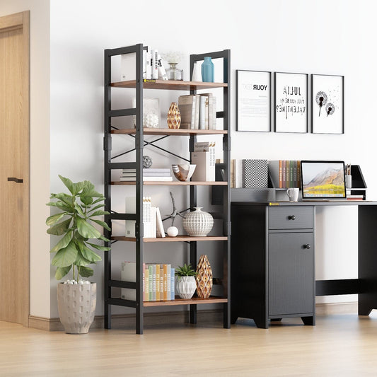 5-Tier Industrial Wooden Bookcase Display Rack with Metal Frame